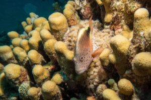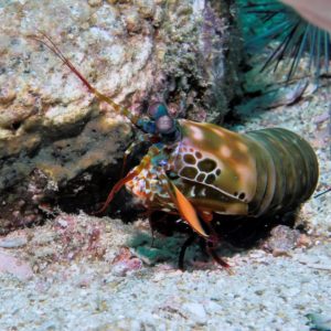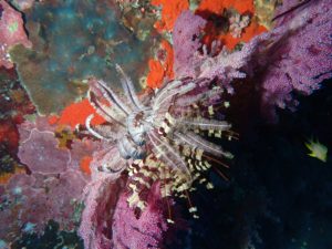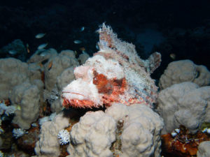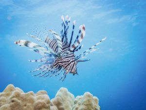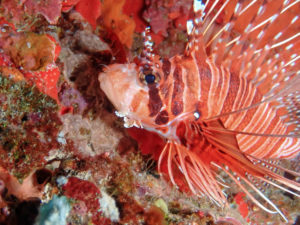 Comme beaucoup de poissons prédateurs (il est malheureusement devenu invasif dans les Caraïbes et déjà et plus récemment en Méditerranée via le canal de Suez), ce spécimen dont les nageoires-épines peuvent créer la paralyse m’observait avec calme et je l’observais en retour fasciné, les yeux dans les yeux, sans que ne nous ne soyons effrayés. Loin d’être agressive avec l’homme, cette espèce se laisse approcher facilement.